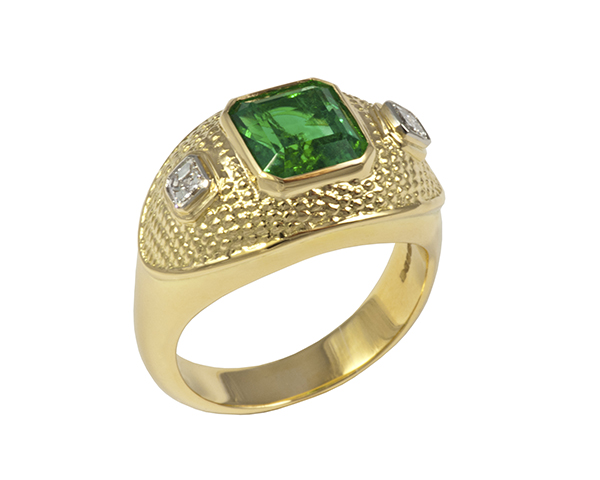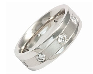 For rings without gemstones, interest may be added by surface designs or two colour metal arrangements. Where gems are required they may be prominent or more discretely set. Where a lady has gems in her wedding band, it’s a charming touch to include a single similar stone in the husband’s band too.